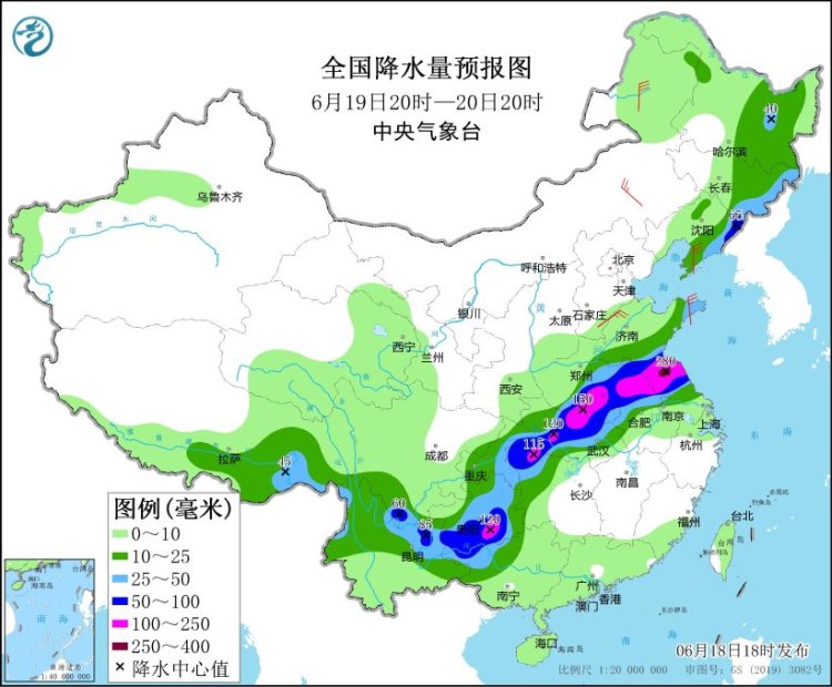 6月18日20时至19日20时,东北地区中西部、华北东部、黄淮、江淮西部、江汉、江南西部和北部、西南地区东部、广西北部等地部分地区有中到大雨,其中,河南中东部、湖北东部和西南部、湖南西北部、四川南部、重庆东南部、贵州中北部和东南部、云南东北部、广西北部等地部分地区有暴雨或大暴雨(100~180毫米)。内蒙古中东部等地部分地区有4~5级风(见图3)。