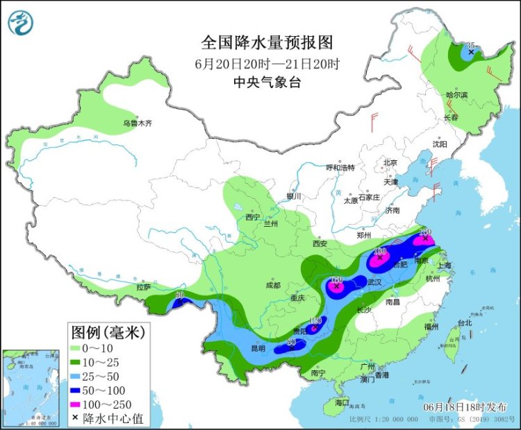 图1 全国强降雨落区预报图(6月18日20时-19日20时)